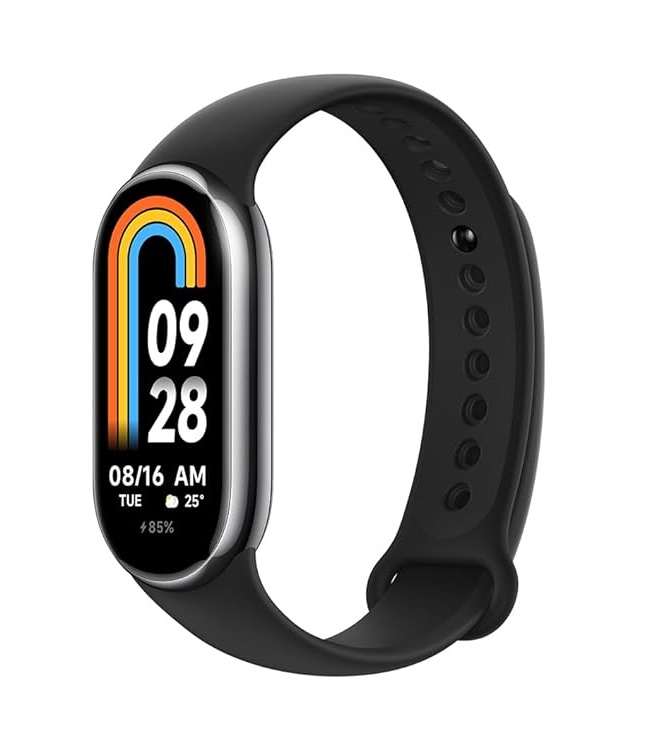 A Xiaomi Smart Band 8, vendida por R$ 450, é a menor das três pulseiras, com um display de 1,62 polegadas, medindo 2,25 x 4,8 x 1,1 cm e pesando 28 gramas.